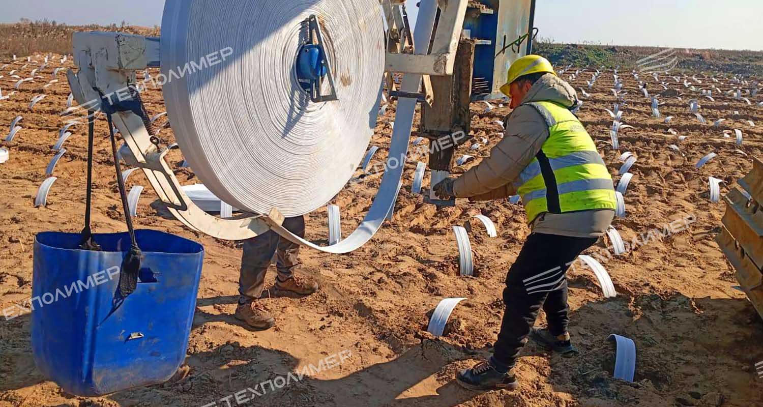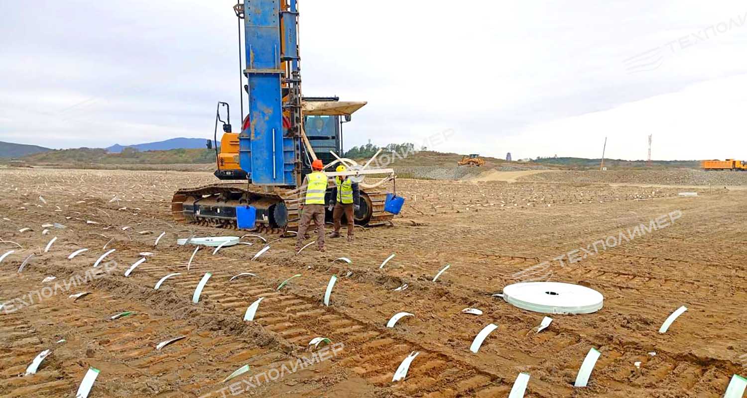 Специализированная техника погрузила геодрены на глубину до 28 метров в слабые водонасыщенные грунты. Для проекта использовалась дрена «ТехПолимер» с гибким полипропиленовым сердечником, окруженным износостойким геотекстильным фильтром. Конструкция ленточной дрены обеспечивает гарантированный водоотвод даже при высоком давлении грунта и позволяет проводить установку на глубинах более 45 метров.