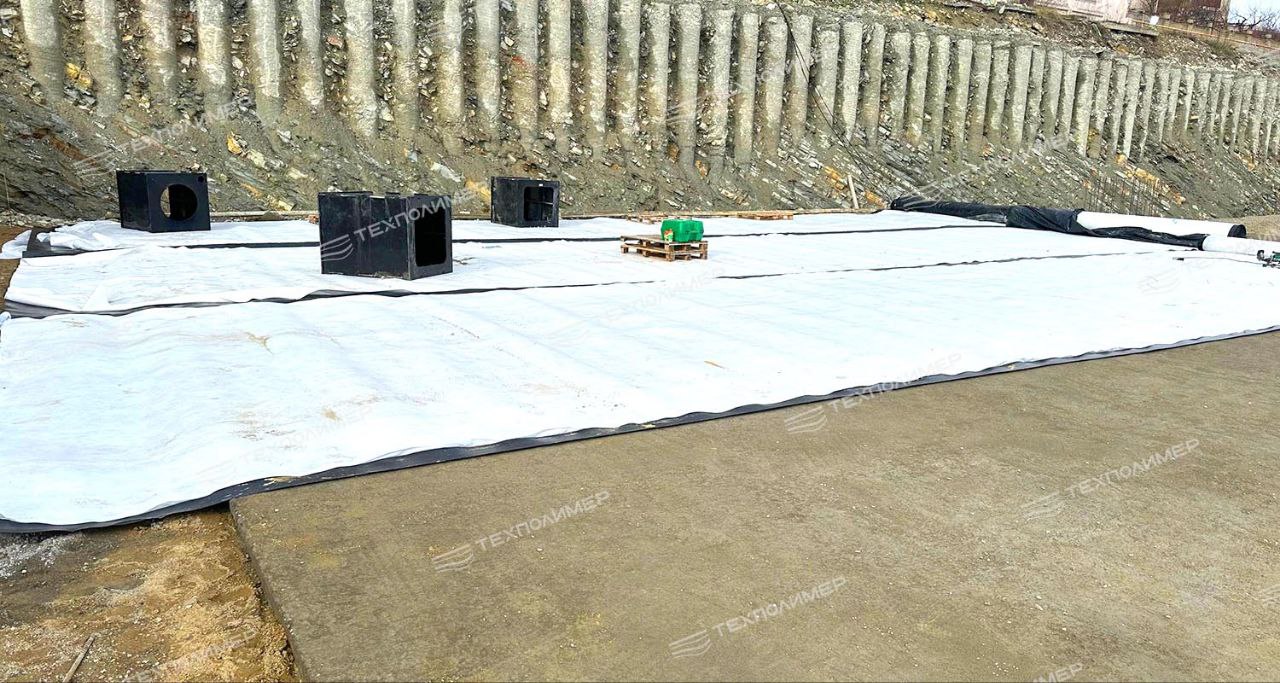 Гладкая геомембрана с двухсторонним защитно-дренирующим покрытием выполняет роль абсолютно герметичного «конверта», внутри которого впоследствии будет смонтирован модульный резервуар «БлокТех». Использование данного материала позволяет: