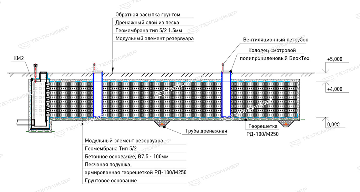 В рамках проекта также предусмотрено устройство системы трубопроводов, дренажных колодцев и экран из геомембраны Тип 5/2, обеспечивающих эффективную работу всей системы водоотведения.