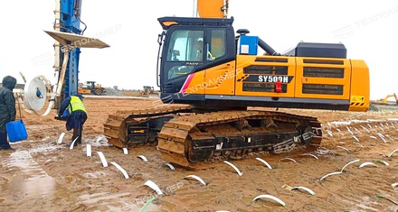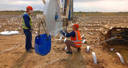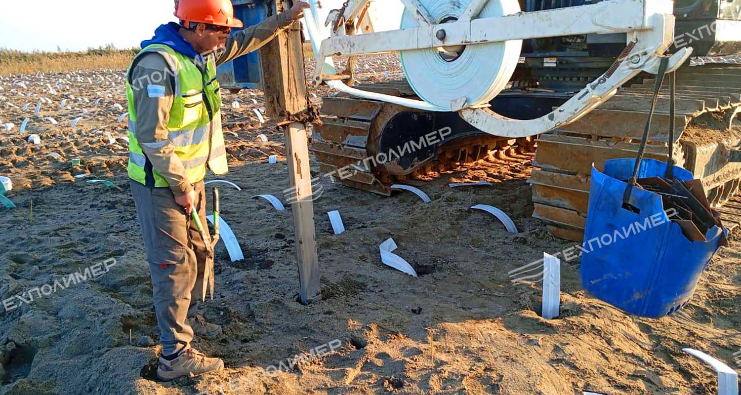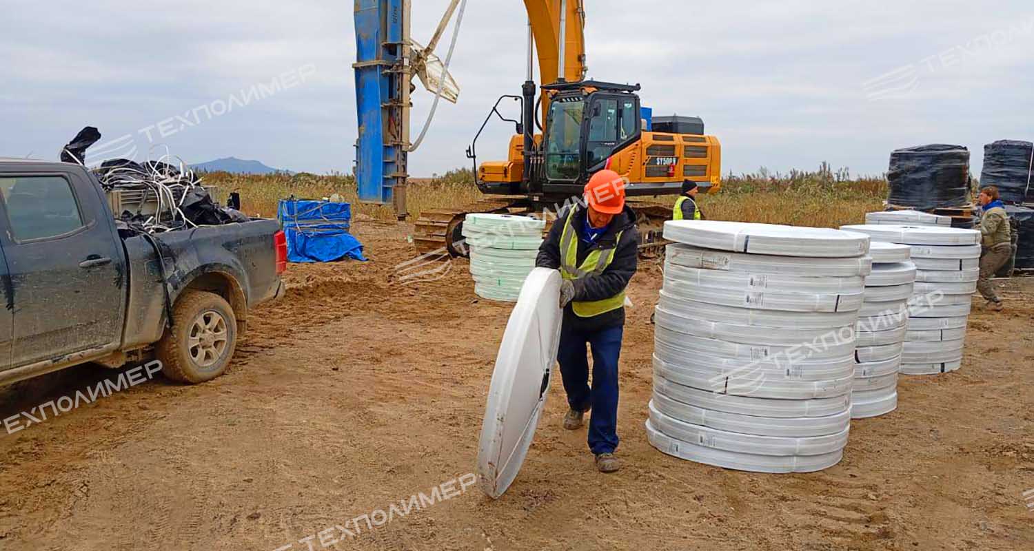 Специализированная техника погрузила геодрены на глубину до 28 метров в слабые водонасыщенные грунты. Для проекта использовалась дрена «ТехПолимер» с гибким полипропиленовым сердечником, окруженным износостойким геотекстильным фильтром. Конструкция ленточной дрены обеспечивает гарантированный водоотвод даже при высоком давлении грунта и позволяет проводить установку на глубинах более 45 метров.
